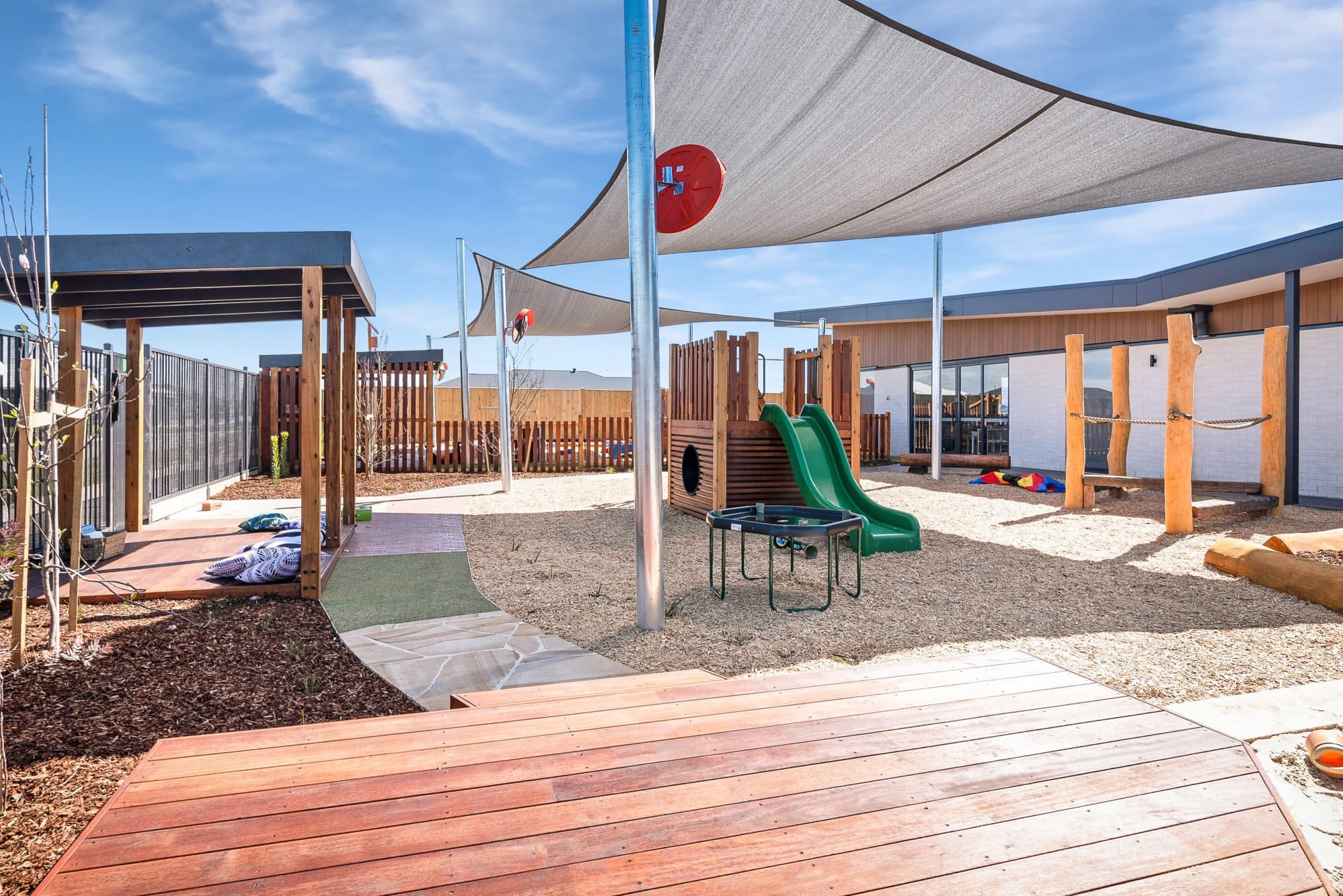 Our Aspire Lucas centre has 7 spacious rooms that support children through their entire learning journey, catering for children aged 6 weeks to 6 years old. Our service is a state-of-the-art facility with beautiful indoor and outdoor environments for children to learn and grow in. The indoor rooms feature various learning spaces and activities, and the outdoor yard includes a fun playground area, swings, sand pits, veggie gardens and more. See some photos of the beautiful Lucs centre, including the learning filled indoor rooms and the spacious outdoor yard.